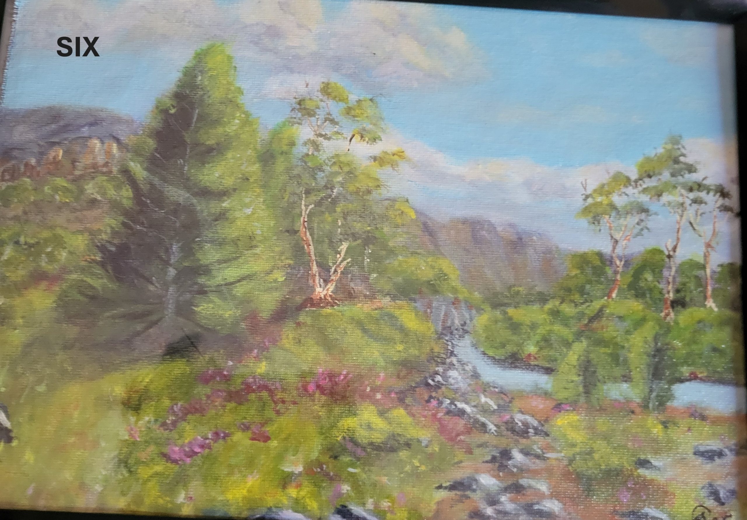 Trevor’s brushwork captures detail, from the bark of a solitary eucalyptus to the ephemeral blush of wildflowers swaying in the breeze. His use of acrylics brings an clarity and richness to the scene, with layers of translucent washes building into textures you can almost reach out and touch.